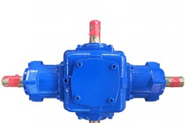 T齿轮转向箱又名T齿轮换向器、伞齿轮转向器,是一种动力传达机构,是减速机中的一个系列,在工业领域有很广泛的应用。转向箱目前已经实现了标准化和规格多样化。转向箱有单轴、双横轴、单纵轴,双纵轴可选。速比1:1、1.5:1、2:1、2.5:1、3:1、4:1、5:1全部为实际传动比。转向箱可以正反运转,低速或高速传动平稳。转向箱当速比不是1:1时,横轴输入、纵轴输出为减速,纵轴输入、横轴输出为增速。